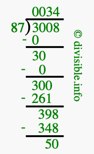 The illustration below shows you how to calculate 3008 divided by 87 using long division. As you can see, the dividend value of 3008 is located to the right of the "⟌" and the divisor value of 87 is located to the left of the "⟌".