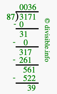 The image displays 36 at the top, which is the quotient, and 39 at the bottom, which is the remainder. Therefore, the answer to 3171 divided by 87 (3171 ÷ 87) using long division is 36 remainder 39, or simply 36 R 39.