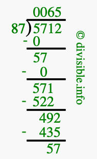The image displays 65 at the top, which is the quotient, and 57 at the bottom, which is the remainder. Therefore, the answer to 5712 divided by 87 (5712 ÷ 87) using long division is 65 remainder 57, or simply 65 R 57.