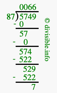 The image displays 66 at the top, which is the quotient, and 7 at the bottom, which is the remainder. Therefore, the answer to 5749 divided by 87 (5749 ÷ 87) using long division is 66 remainder 7, or simply 66 R 7.