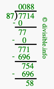 The image displays 88 at the top, which is the quotient, and 58 at the bottom, which is the remainder. Therefore, the answer to 7714 divided by 87 (7714 ÷ 87) using long division is 88 remainder 58, or simply 88 R 58.