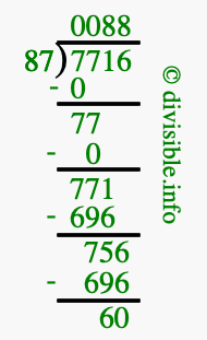 The image displays 88 at the top, which is the quotient, and 60 at the bottom, which is the remainder. Therefore, the answer to 7716 divided by 87 (7716 ÷ 87) using long division is 88 remainder 60, or simply 88 R 60.
