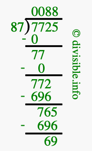 The image displays 88 at the top, which is the quotient, and 69 at the bottom, which is the remainder. Therefore, the answer to 7725 divided by 87 (7725 ÷ 87) using long division is 88 remainder 69, or simply 88 R 69.
