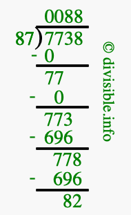 The image displays 88 at the top, which is the quotient, and 82 at the bottom, which is the remainder. Therefore, the answer to 7738 divided by 87 (7738 ÷ 87) using long division is 88 remainder 82, or simply 88 R 82.