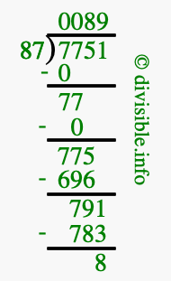 The illustration below shows you how to calculate 7751 divided by 87 using long division. As you can see, the dividend value of 7751 is located to the right of the "⟌" and the divisor value of 87 is located to the left of the "⟌".