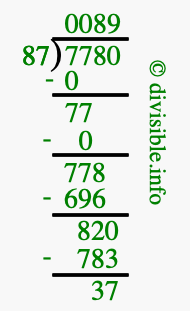 The image displays 89 at the top, which is the quotient, and 37 at the bottom, which is the remainder. Therefore, the answer to 7780 divided by 87 (7780 ÷ 87) using long division is 89 remainder 37, or simply 89 R 37.