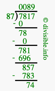The image displays 89 at the top, which is the quotient, and 74 at the bottom, which is the remainder. Therefore, the answer to 7817 divided by 87 (7817 ÷ 87) using long division is 89 remainder 74, or simply 89 R 74.