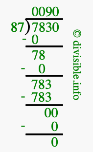 Here we will show you an image that illustrates how to calculate 7830 divided by 87 using long division. We will also give you the answer to 7830 divided by 87 (7830 ÷ 87) as a fraction and as a decimal.