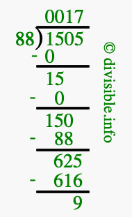 The image displays 17 at the top, which is the quotient, and 9 at the bottom, which is the remainder. Therefore, the answer to 1505 divided by 88 (1505 ÷ 88) using long division is 17 remainder 9, or simply 17 R 9.