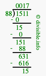The image displays 17 at the top, which is the quotient, and 15 at the bottom, which is the remainder. Therefore, the answer to 1511 divided by 88 (1511 ÷ 88) using long division is 17 remainder 15, or simply 17 R 15.