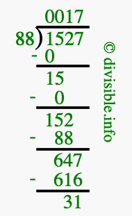 The image displays 17 at the top, which is the quotient, and 31 at the bottom, which is the remainder. Therefore, the answer to 1527 divided by 88 (1527 ÷ 88) using long division is 17 remainder 31, or simply 17 R 31.