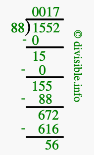 The image displays 17 at the top, which is the quotient, and 56 at the bottom, which is the remainder. Therefore, the answer to 1552 divided by 88 (1552 ÷ 88) using long division is 17 remainder 56, or simply 17 R 56.