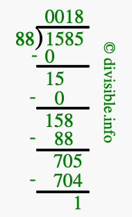 The image displays 18 at the top, which is the quotient, and 1 at the bottom, which is the remainder. Therefore, the answer to 1585 divided by 88 (1585 ÷ 88) using long division is 18 remainder 1, or simply 18 R 1.