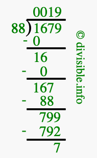 The image displays 19 at the top, which is the quotient, and 7 at the bottom, which is the remainder. Therefore, the answer to 1679 divided by 88 (1679 ÷ 88) using long division is 19 remainder 7, or simply 19 R 7.