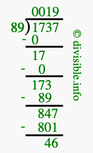 The image displays 19 at the top, which is the quotient, and 46 at the bottom, which is the remainder. Therefore, the answer to 1737 divided by 89 (1737 ÷ 89) using long division is 19 remainder 46, or simply 19 R 46.
