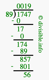 The image displays 19 at the top, which is the quotient, and 56 at the bottom, which is the remainder. Therefore, the answer to 1747 divided by 89 (1747 ÷ 89) using long division is 19 remainder 56, or simply 19 R 56.
