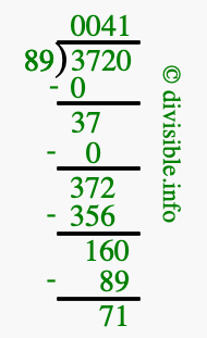 The image displays 41 at the top, which is the quotient, and 71 at the bottom, which is the remainder. Therefore, the answer to 3720 divided by 89 (3720 ÷ 89) using long division is 41 remainder 71, or simply 41 R 71.