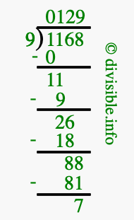 The image displays 129 at the top, which is the quotient, and 7 at the bottom, which is the remainder. Therefore, the answer to 1168 divided by 9 (1168 ÷ 9) using long division is 129 remainder 7, or simply 129 R 7.