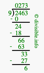 The image displays 273 at the top, which is the quotient, and 6 at the bottom, which is the remainder. Therefore, the answer to 2463 divided by 9 (2463 ÷ 9) using long division is 273 remainder 6, or simply 273 R 6.