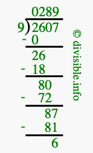 The image displays 289 at the top, which is the quotient, and 6 at the bottom, which is the remainder. Therefore, the answer to 2607 divided by 9 (2607 ÷ 9) using long division is 289 remainder 6, or simply 289 R 6.