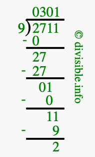 The image displays 301 at the top, which is the quotient, and 2 at the bottom, which is the remainder. Therefore, the answer to 2711 divided by 9 (2711 ÷ 9) using long division is 301 remainder 2, or simply 301 R 2.