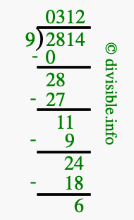 The image displays 312 at the top, which is the quotient, and 6 at the bottom, which is the remainder. Therefore, the answer to 2814 divided by 9 (2814 ÷ 9) using long division is 312 remainder 6, or simply 312 R 6.