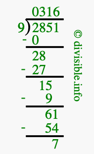 The image displays 316 at the top, which is the quotient, and 7 at the bottom, which is the remainder. Therefore, the answer to 2851 divided by 9 (2851 ÷ 9) using long division is 316 remainder 7, or simply 316 R 7.