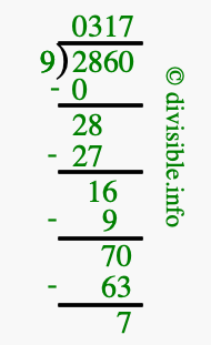 The image displays 317 at the top, which is the quotient, and 7 at the bottom, which is the remainder. Therefore, the answer to 2860 divided by 9 (2860 ÷ 9) using long division is 317 remainder 7, or simply 317 R 7.
