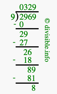 The image displays 329 at the top, which is the quotient, and 8 at the bottom, which is the remainder. Therefore, the answer to 2969 divided by 9 (2969 ÷ 9) using long division is 329 remainder 8, or simply 329 R 8.