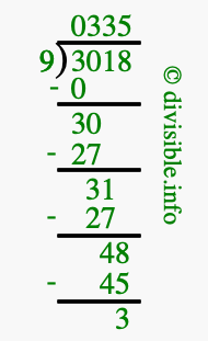 The image displays 335 at the top, which is the quotient, and 3 at the bottom, which is the remainder. Therefore, the answer to 3018 divided by 9 (3018 ÷ 9) using long division is 335 remainder 3, or simply 335 R 3.