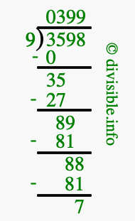 The image displays 399 at the top, which is the quotient, and 7 at the bottom, which is the remainder. Therefore, the answer to 3598 divided by 9 (3598 ÷ 9) using long division is 399 remainder 7, or simply 399 R 7.