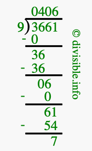 The image displays 406 at the top, which is the quotient, and 7 at the bottom, which is the remainder. Therefore, the answer to 3661 divided by 9 (3661 ÷ 9) using long division is 406 remainder 7, or simply 406 R 7.