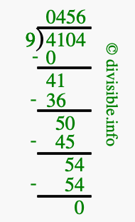 Here we will show you an image that illustrates how to calculate 4104 divided by 9 using long division. We will also give you the answer to 4104 divided by 9 (4104 ÷ 9) as a fraction and as a decimal.