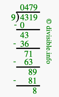 Here we will show you an image that illustrates how to calculate 4319 divided by 9 using long division. We will also give you the answer to 4319 divided by 9 (4319 ÷ 9) as a fraction and as a decimal.