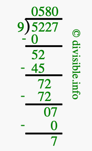 The image displays 580 at the top, which is the quotient, and 7 at the bottom, which is the remainder. Therefore, the answer to 5227 divided by 9 (5227 ÷ 9) using long division is 580 remainder 7, or simply 580 R 7.