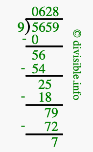 Here we will show you an image that illustrates how to calculate 5659 divided by 9 using long division. We will also give you the answer to 5659 divided by 9 (5659 ÷ 9) as a fraction and as a decimal.