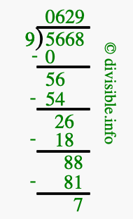 The image displays 629 at the top, which is the quotient, and 7 at the bottom, which is the remainder. Therefore, the answer to 5668 divided by 9 (5668 ÷ 9) using long division is 629 remainder 7, or simply 629 R 7.