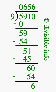 Here we will show you an image that illustrates how to calculate 5910 divided by 9 using long division. We will also give you the answer to 5910 divided by 9 (5910 ÷ 9) as a fraction and as a decimal.