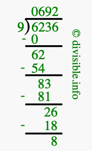 The image displays 692 at the top, which is the quotient, and 8 at the bottom, which is the remainder. Therefore, the answer to 6236 divided by 9 (6236 ÷ 9) using long division is 692 remainder 8, or simply 692 R 8.