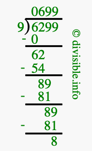 The image displays 699 at the top, which is the quotient, and 8 at the bottom, which is the remainder. Therefore, the answer to 6299 divided by 9 (6299 ÷ 9) using long division is 699 remainder 8, or simply 699 R 8.