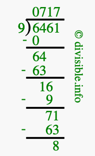 Here we will show you an image that illustrates how to calculate 6461 divided by 9 using long division. We will also give you the answer to 6461 divided by 9 (6461 ÷ 9) as a fraction and as a decimal.