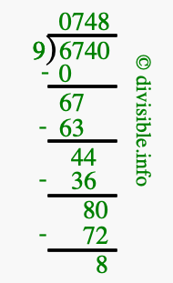 Here we will show you an image that illustrates how to calculate 6740 divided by 9 using long division. We will also give you the answer to 6740 divided by 9 (6740 ÷ 9) as a fraction and as a decimal.