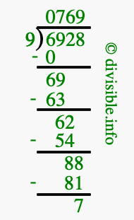 The image displays 769 at the top, which is the quotient, and 7 at the bottom, which is the remainder. Therefore, the answer to 6928 divided by 9 (6928 ÷ 9) using long division is 769 remainder 7, or simply 769 R 7.
