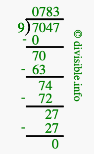 The image displays 783 at the top, which is the quotient, and 0 at the bottom, which is the remainder. Therefore, the answer to 7047 divided by 9 (7047 ÷ 9) using long division is 783 remainder 0, or simply 783 R 0.