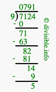 The image displays 791 at the top, which is the quotient, and 5 at the bottom, which is the remainder. Therefore, the answer to 7124 divided by 9 (7124 ÷ 9) using long division is 791 remainder 5, or simply 791 R 5.