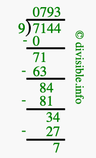 The image displays 793 at the top, which is the quotient, and 7 at the bottom, which is the remainder. Therefore, the answer to 7144 divided by 9 (7144 ÷ 9) using long division is 793 remainder 7, or simply 793 R 7.