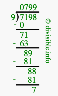 The image displays 799 at the top, which is the quotient, and 7 at the bottom, which is the remainder. Therefore, the answer to 7198 divided by 9 (7198 ÷ 9) using long division is 799 remainder 7, or simply 799 R 7.