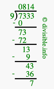The illustration below shows you how to calculate 7333 divided by 9 using long division. As you can see, the dividend value of 7333 is located to the right of the "⟌" and the divisor value of 9 is located to the left of the "⟌".