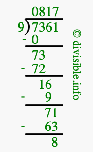 Here we will show you an image that illustrates how to calculate 7361 divided by 9 using long division. We will also give you the answer to 7361 divided by 9 (7361 ÷ 9) as a fraction and as a decimal.