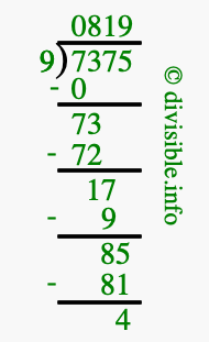 The image displays 819 at the top, which is the quotient, and 4 at the bottom, which is the remainder. Therefore, the answer to 7375 divided by 9 (7375 ÷ 9) using long division is 819 remainder 4, or simply 819 R 4.